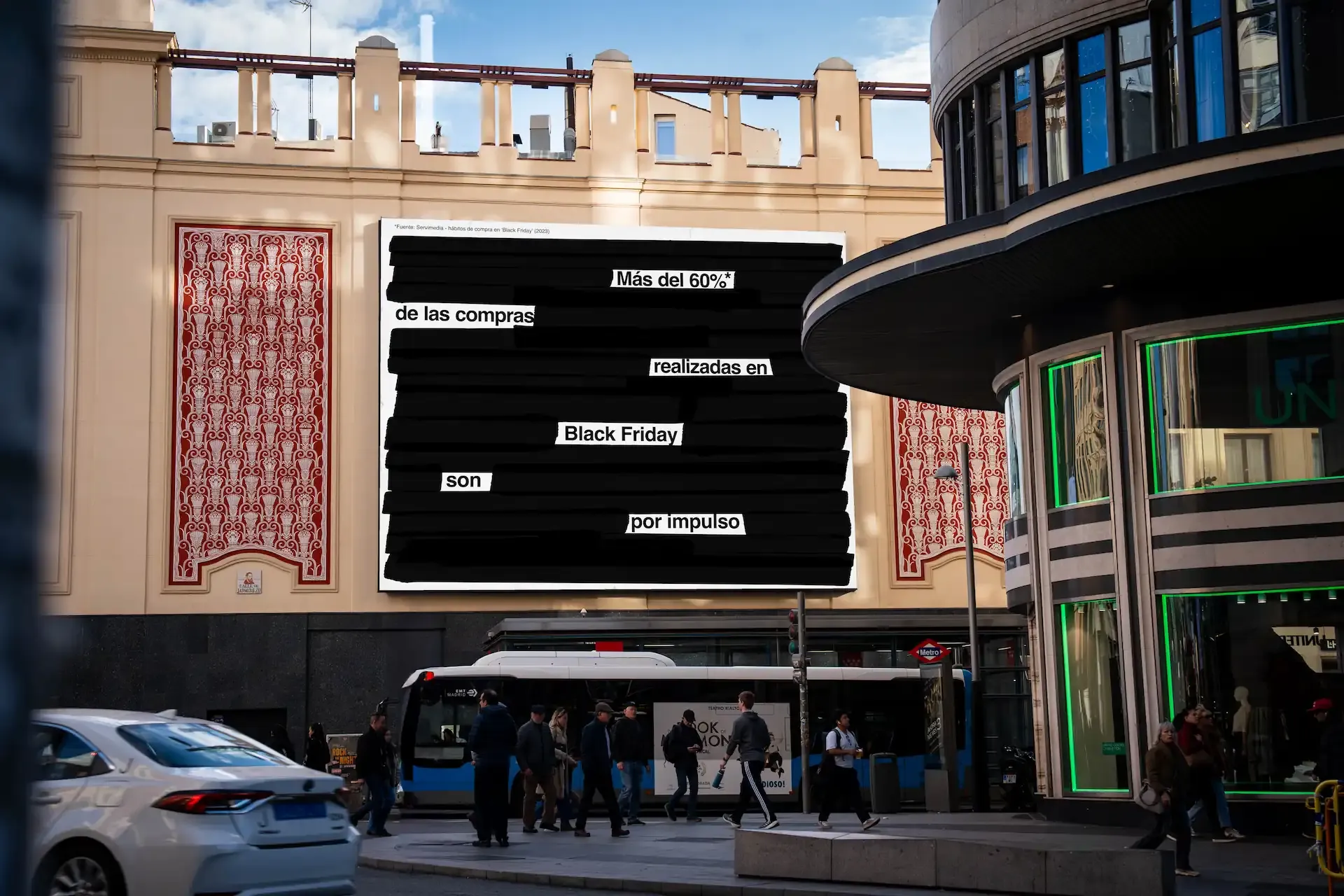 More than 60% of Black Friday purchases are impulsive. 39% of shoppers admit to regretting buying products they didn't really need. On Black Friday, we fought the noise with visual silence, buying advertising space so that other brands couldn't buy it.